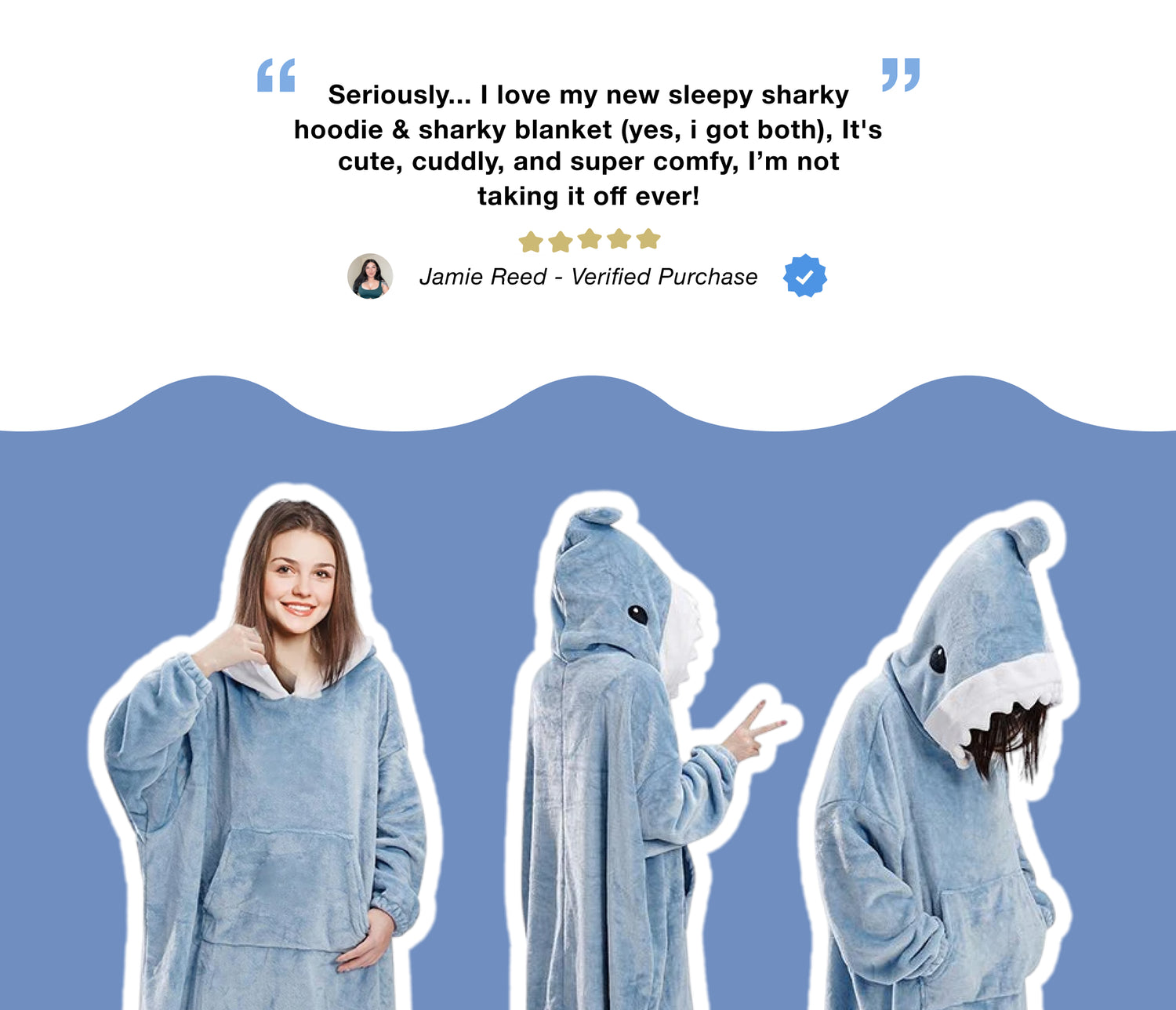Discover premium quality unique loungewear Shark themed Blankets & become a cozy and comfy Sharky all day with our original Sleepy Sharky™ Shark Blanket, Sharky Hoodie & Comfy Oversized Shark Slippers